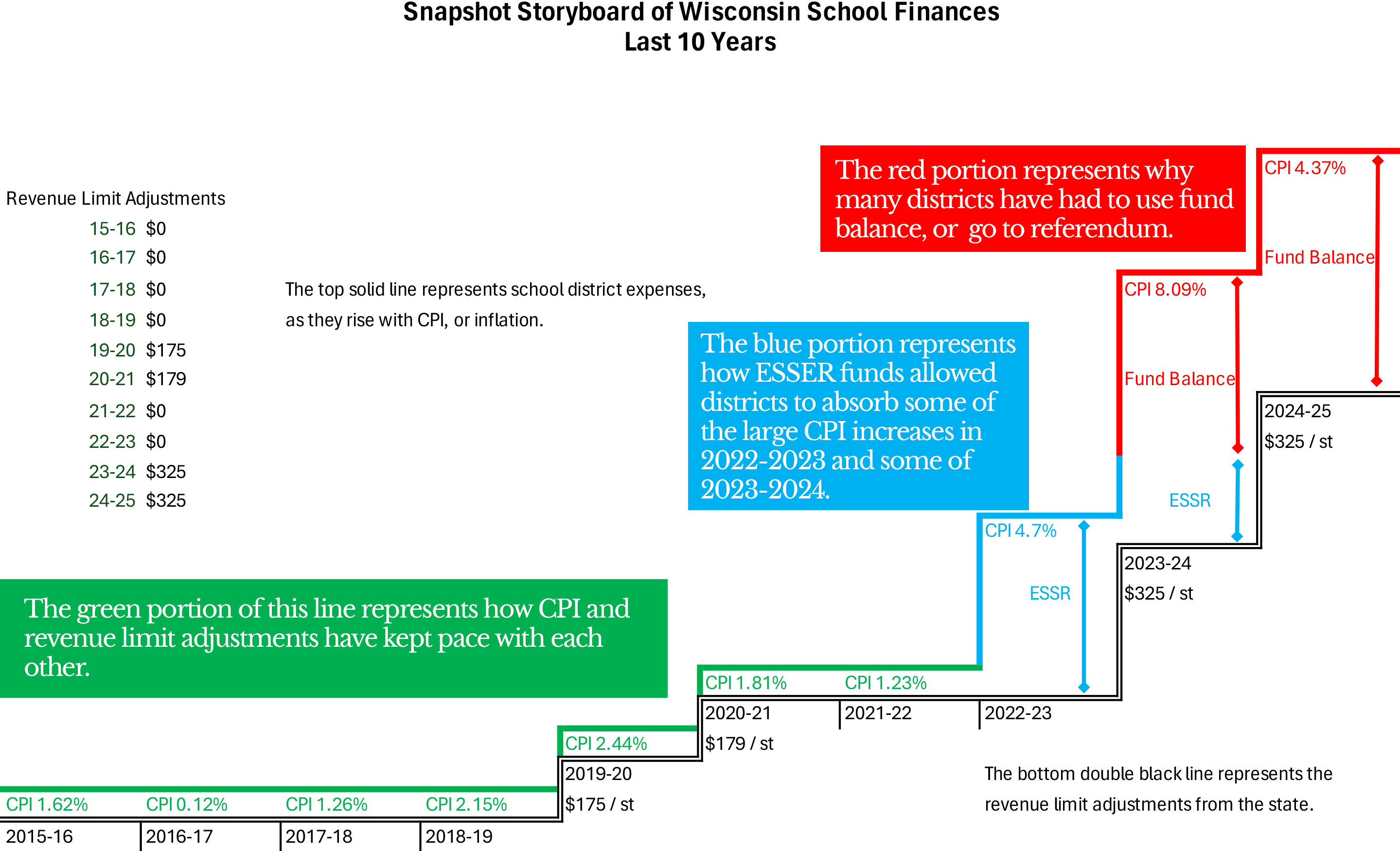 From 1994 to 2009, school district funding increased with inflation, allowing schools to meet their needs as operational costs increased. Since 2009, a state-imposed funding limit was implemented and state aid no longer increased to reflect inflation costs. By the end of 2025, the revenue limit will have fallen $3,300 per student behind inflation (wasbo.com).